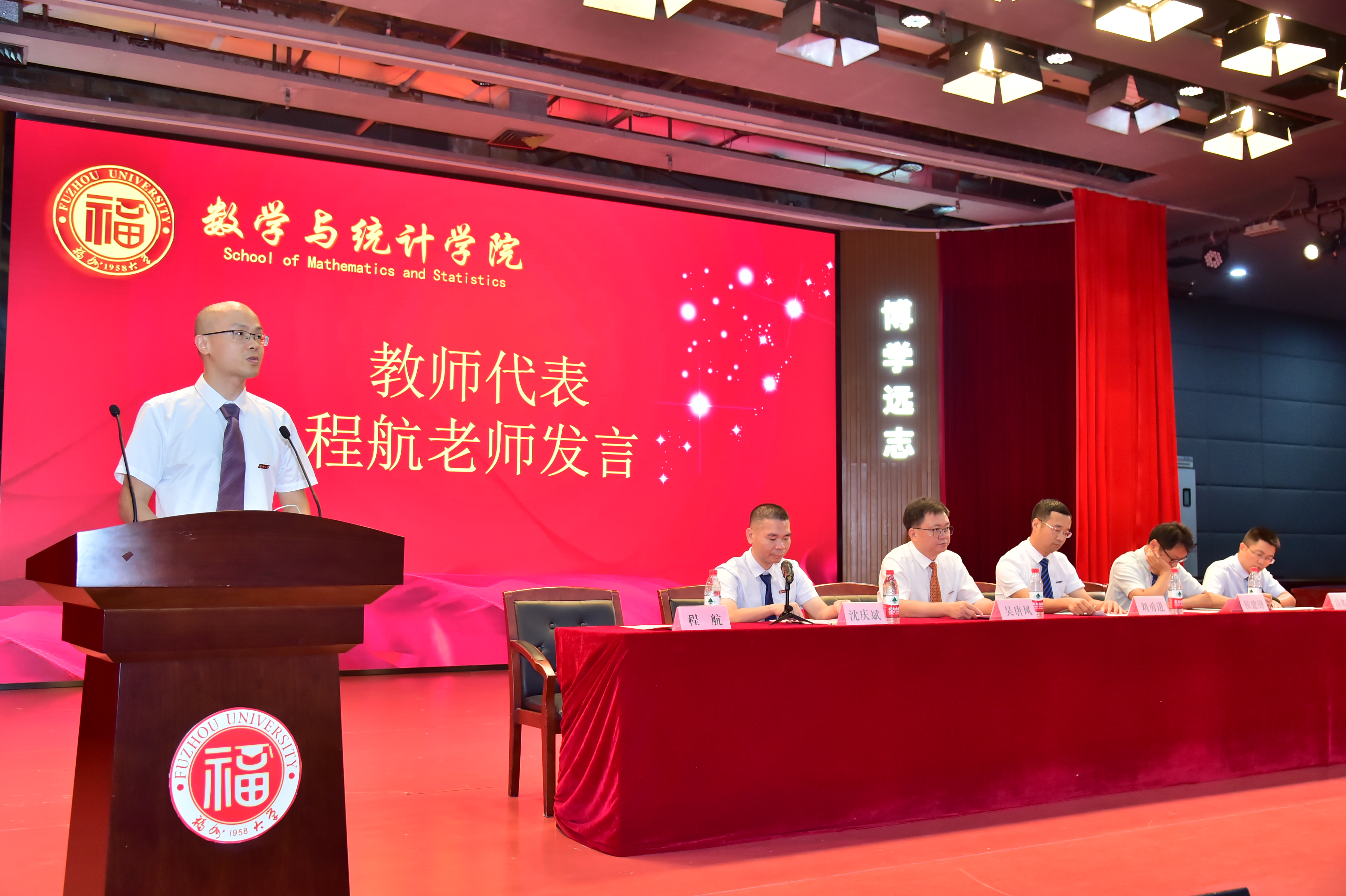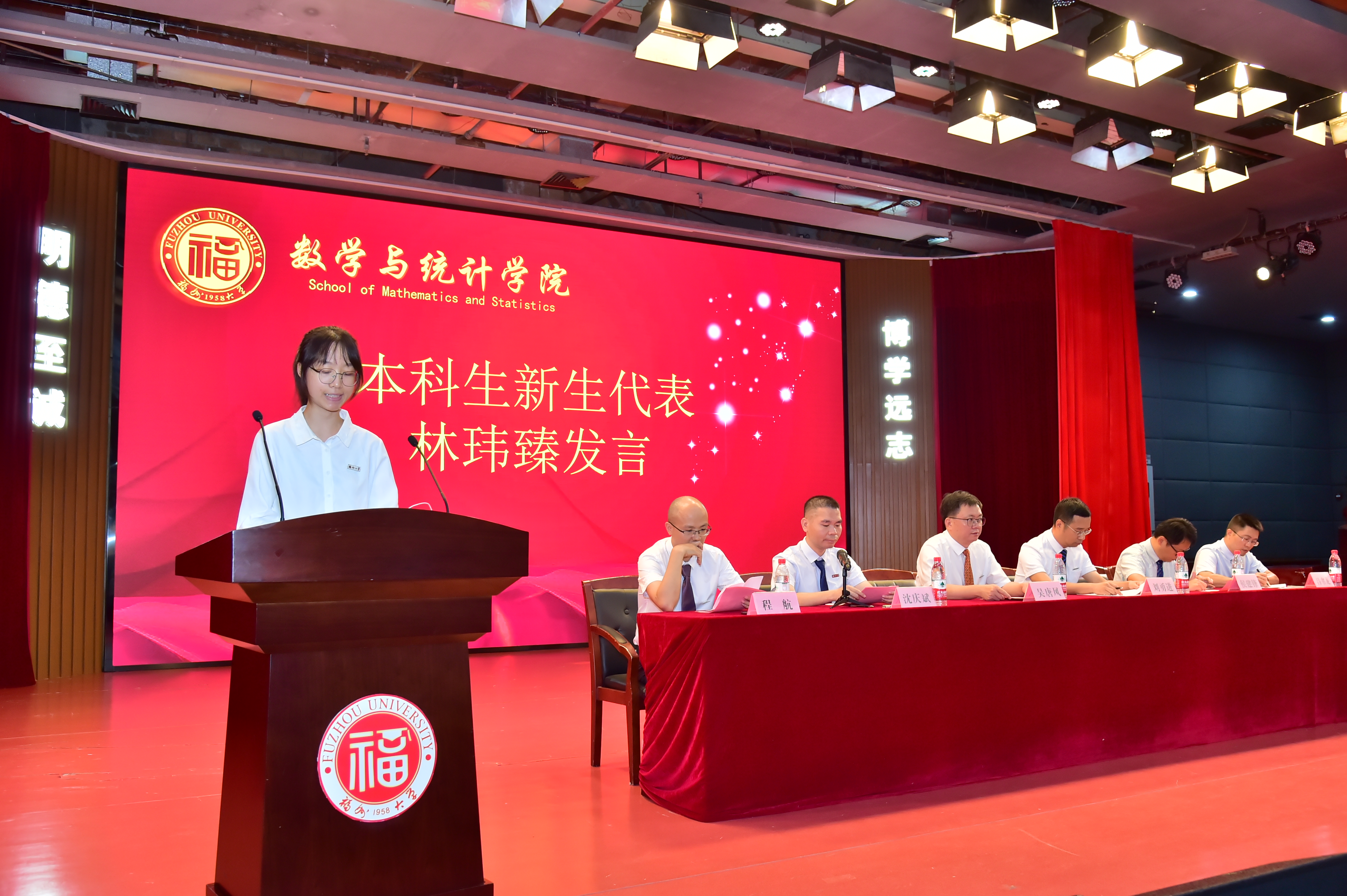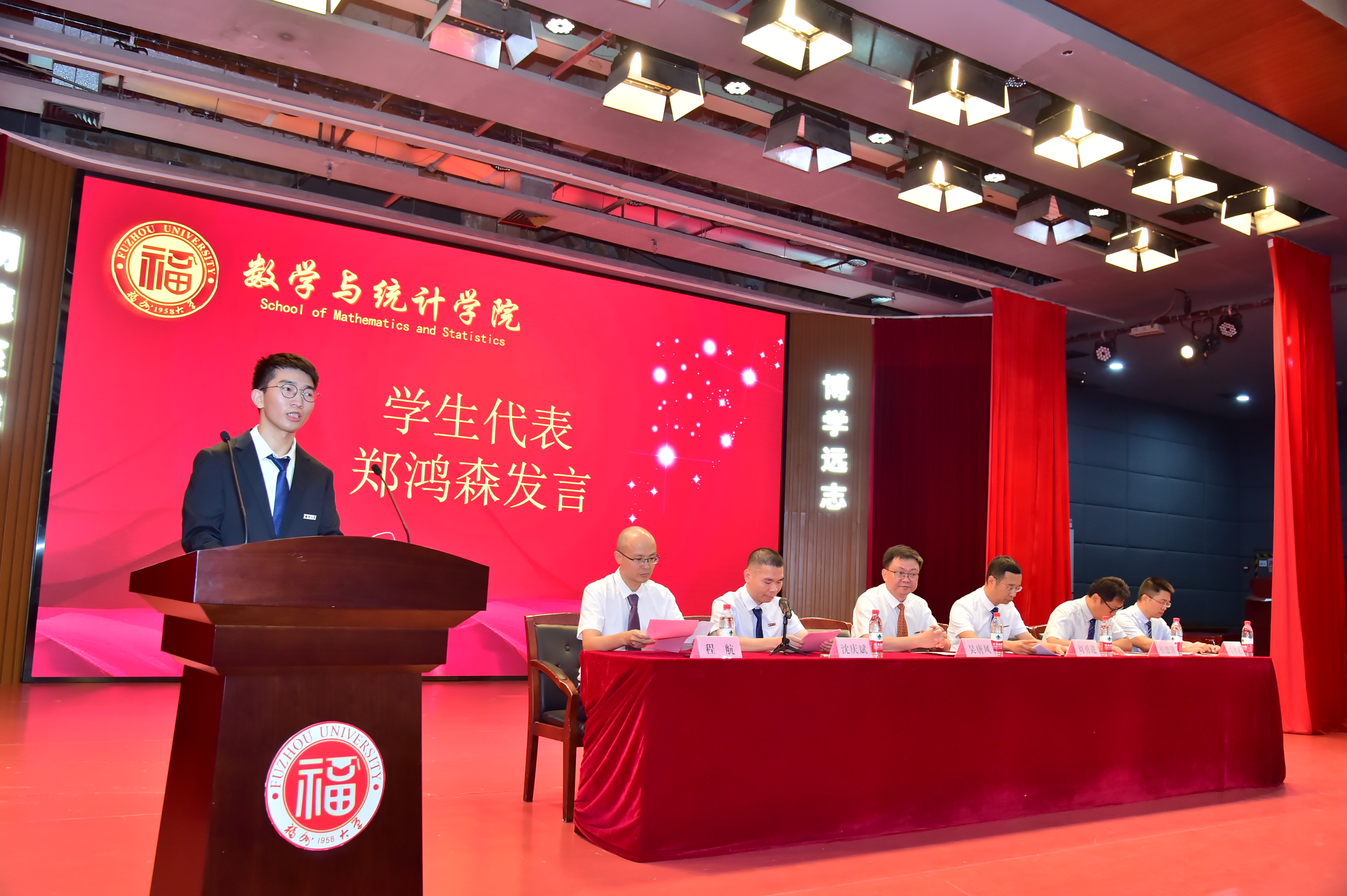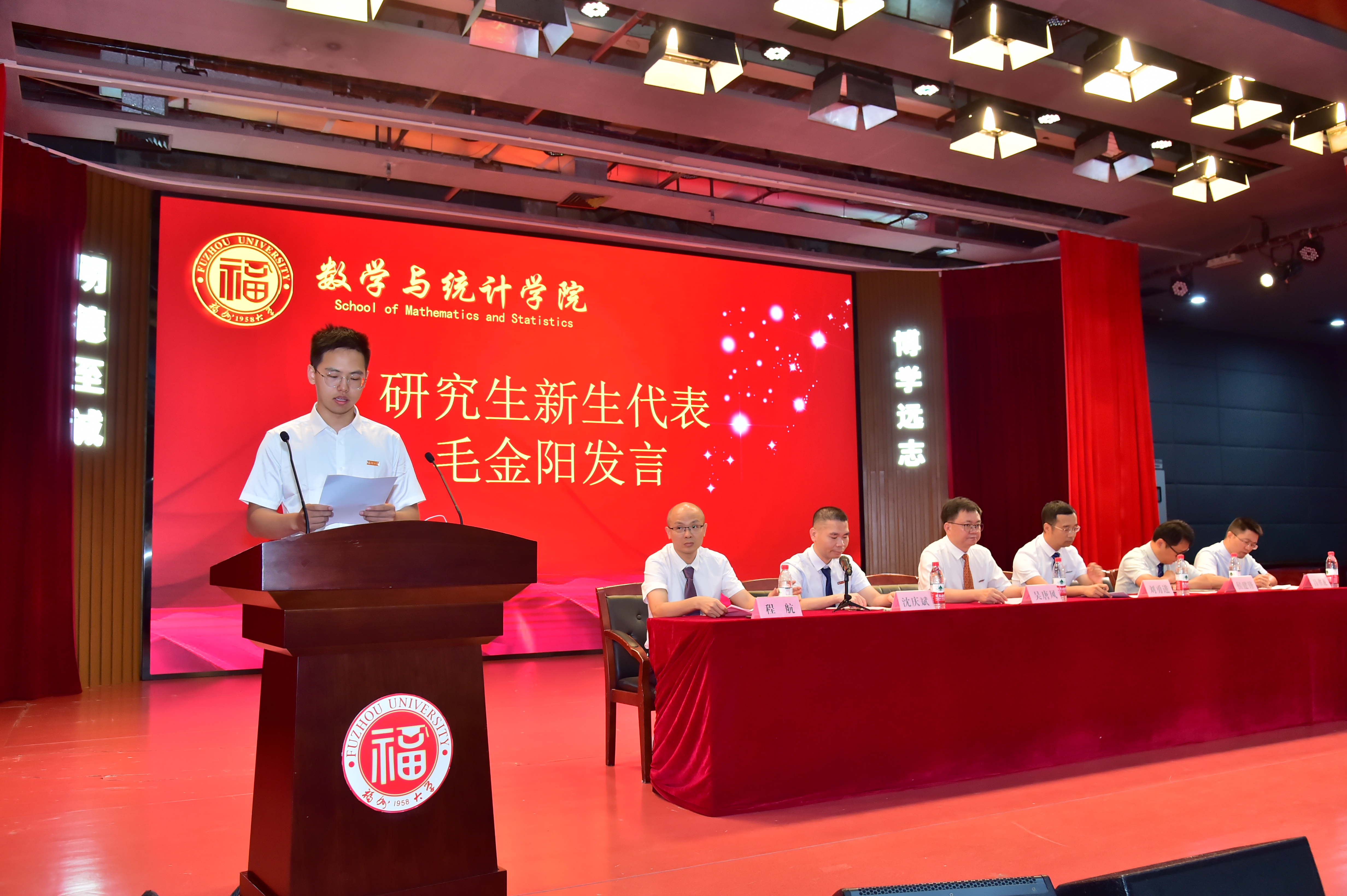 老生代表2020级数学类本科生郑鸿森,他代表学院学长、学姐对新同学表示欢迎;新生2022级数学类本科生林玮臻、2022级应用统计研究生毛金阳分别上台发言,他们在表达对学院感谢之意外,也表示承诺遵守校训、勇挑重担,力争成为民族之骄傲、国家之栋梁。