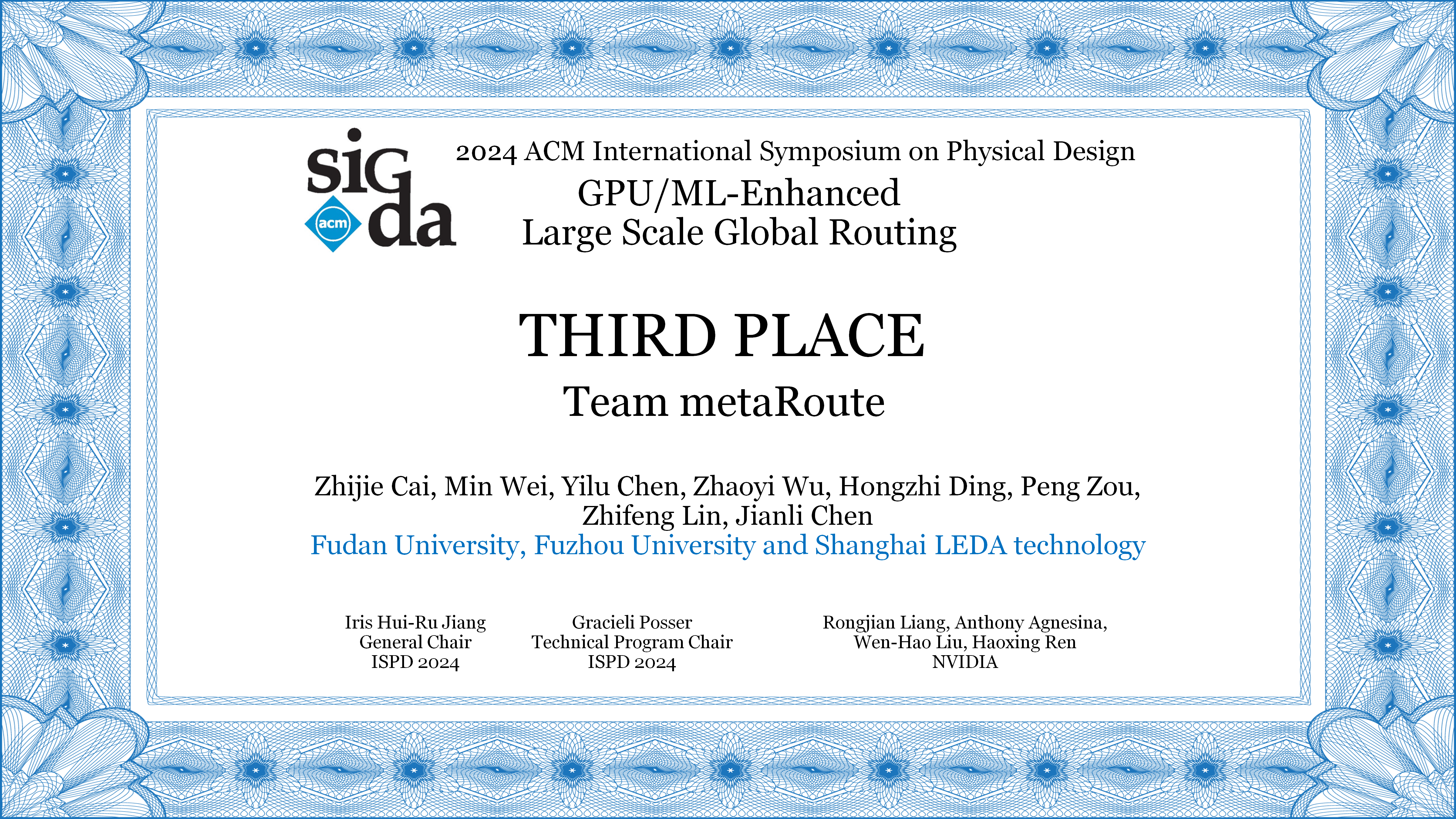 林智锋副研究员和2021级博士生陈忆鹭、计算机与大数据学院2023级研究生吴昭怡与复旦大学、上海立芯软件科技有限公司组成的联队获得了ISPD竞赛全球第三名,在此向获奖者表示热烈祝贺!