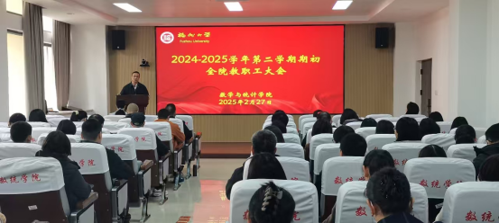 2025年春季新学期干部大会精神,强调学院上下要紧紧围绕学校“八大重点任务”,统一思想、凝聚共识,锚定“十四五”规划、“11个一流”建设和“1445战略工程”等决策部署,聚焦学院发展目标任务,以奋勇争先书写“福大发展、数统何为”的满意答卷;并强调了新学期教职工返校、教师队伍建设和校园安全稳定等工作事宜。