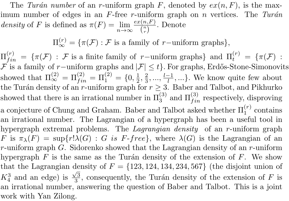 报告题目:Turan densities and Lagrangian densities of hypergraphs