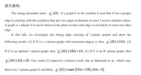报告主题:Strong edge coloring of 1-planar graphs