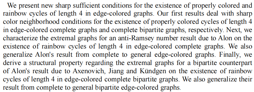报告题目:Properly colored and rainbow cycles of length 4 in edge-colored graphs