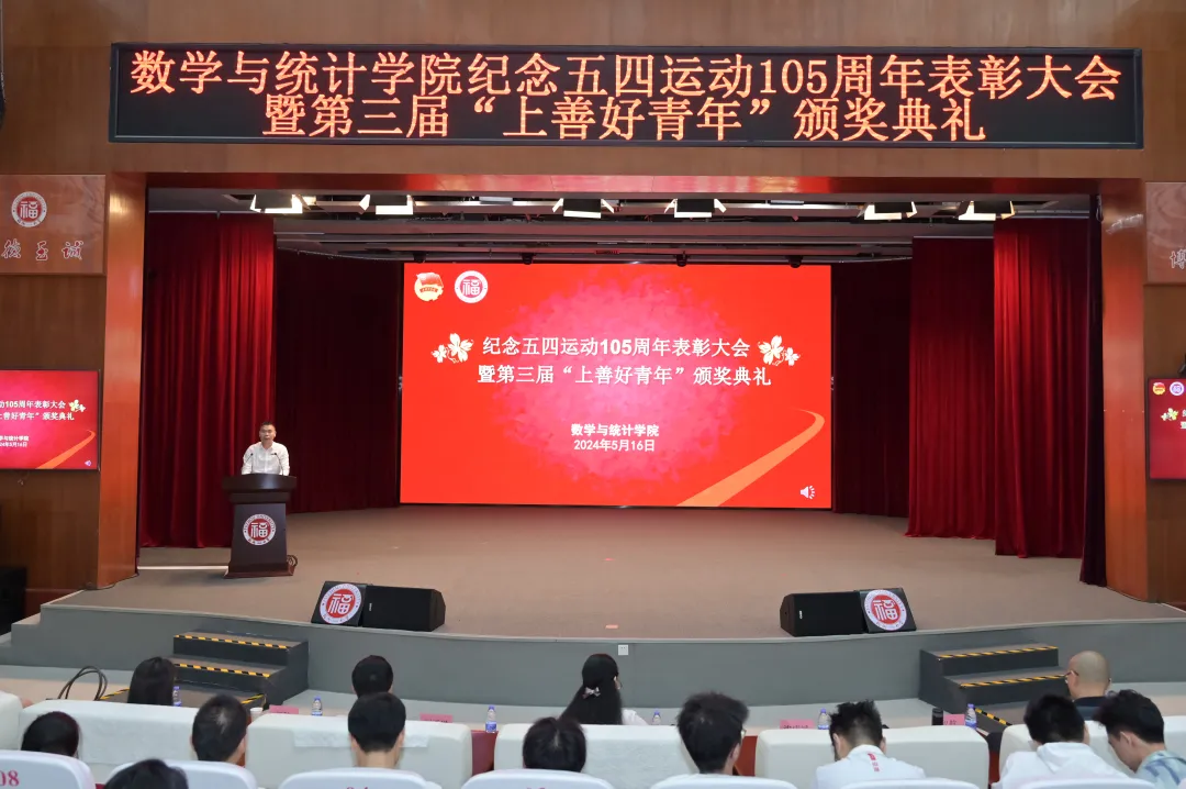 在旗山校区图书馆博学厅隆重举行纪念五四运动105周年表彰大会暨第三届上善好青年颁奖典礼。学院党委郑世珠书记、院长刘勇进教授、副书记沈庆斌、副院长程航教授、院工会主席吕书龙副教授、信息与计算科学系林智锋博士、团委副书记权斌、辅导员舒婧妍和傅源源,获奖代表和青年师生代表,以及平安产险福建分公司人事行政部经理江航和招聘经理杨丁威等400多人参加本次大会。大会由学院党委副书记沈庆斌主持。