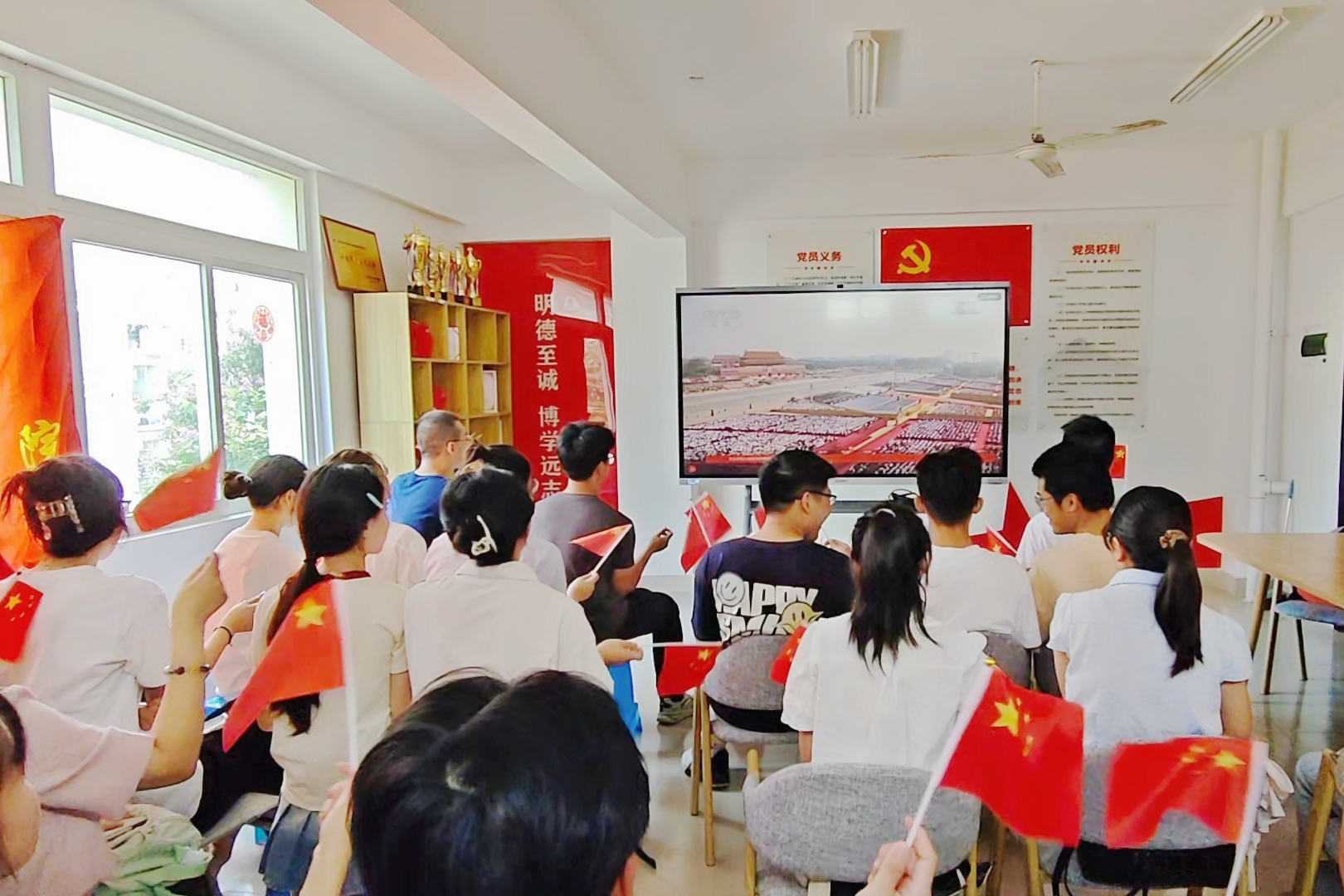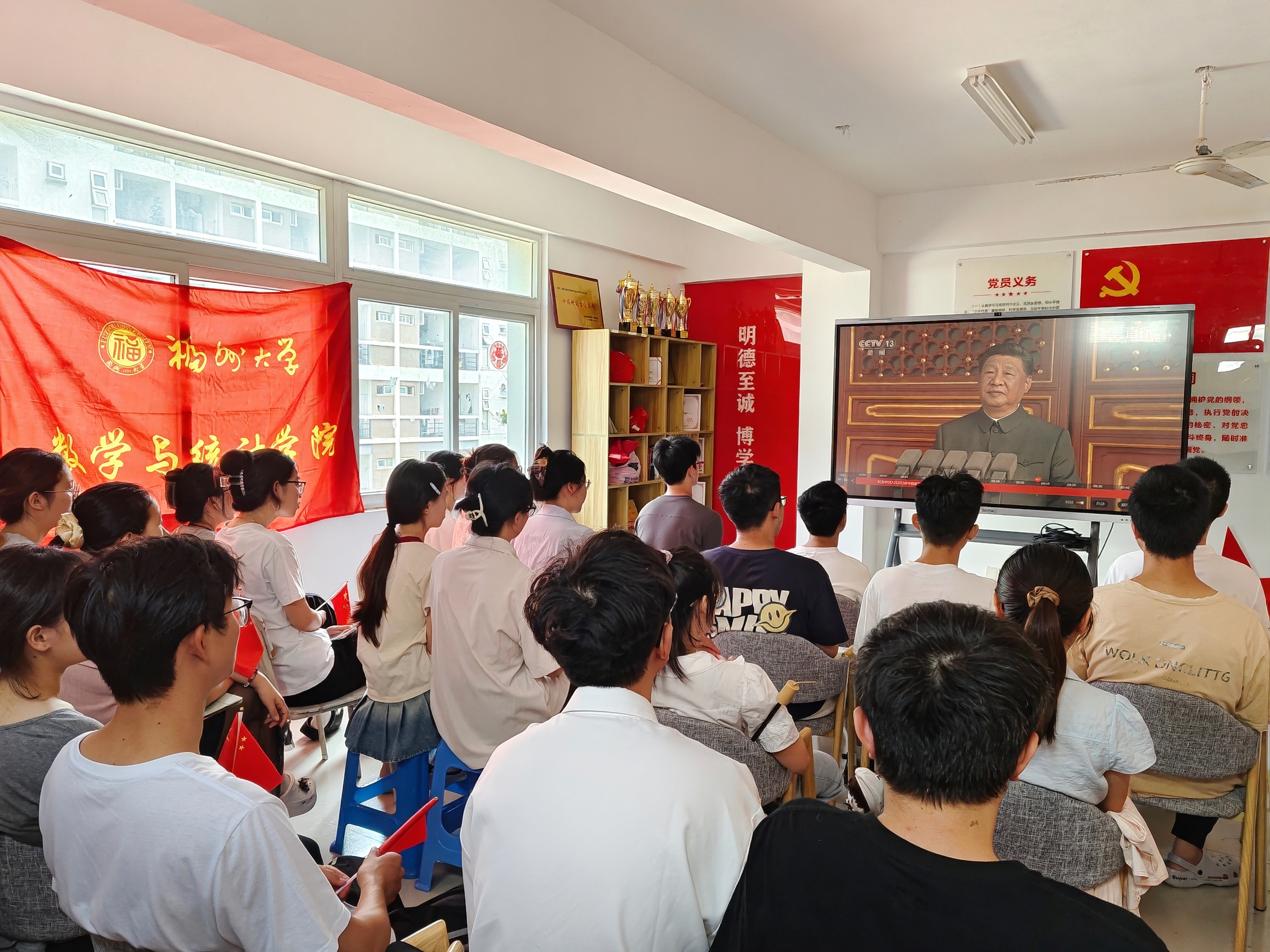 铁血岁月虽已远,抗战精神永流传。2025年9月3日上午,纪念中国人民抗日战争暨世界反法西斯战争胜利80周年大会在北京天安门广场隆重举行。数统学院于学生公寓35号楼2楼“一站式”学生社区共享活动室组织暑期留校学生观看了大会直播,通过一方屏幕,感受历史的厚重与时代的荣光。辅导员许佳琦、兼职辅导员傅源源与暑期留校学生共同观看了这场意义非凡的历史性盛会。