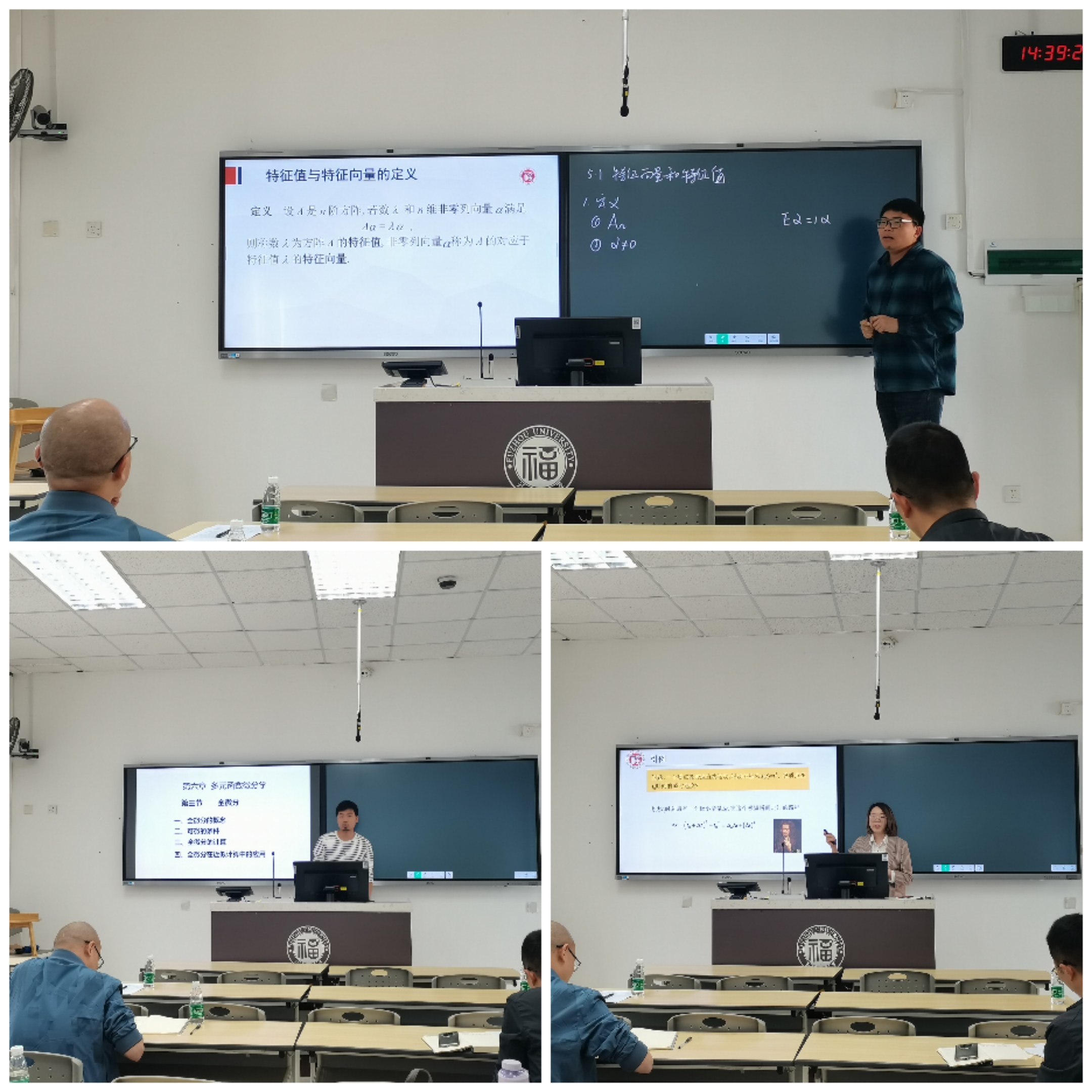 2024年3月29日下午,在学院工会和教学办共同组织下,数统学院青年教师“最佳一节课”竞赛与教学观摩活动在教学楼西1-204室举行。学院党委书记郑世珠、分管教学副院长程航和专任教师吕书龙、曾勋勋、薛美玉、王平以及参赛和新引进教师参加了本次活动。