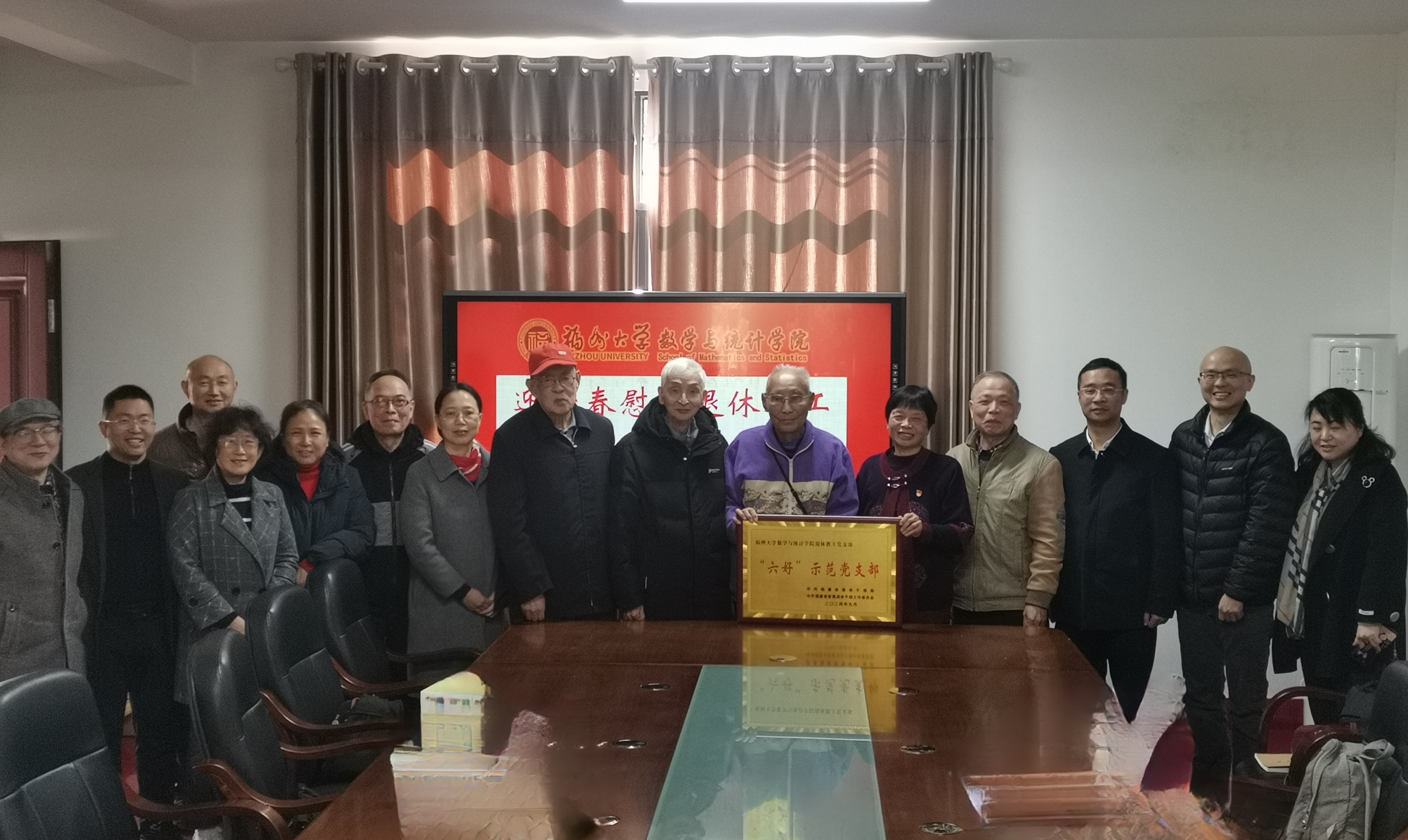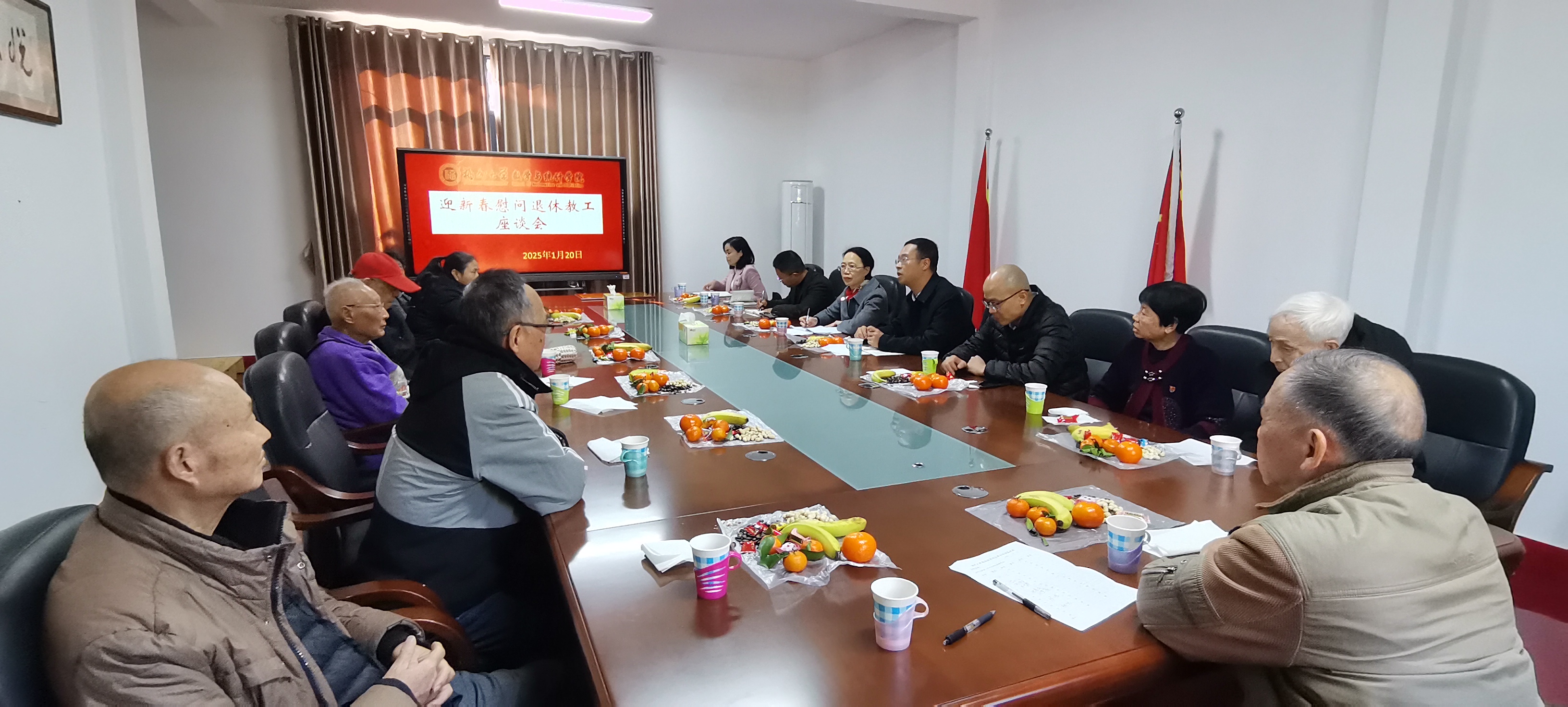 在新春佳节来临之际,1月20日,数统学院在怡山校区校离退休工作室二层会议室召开退休教职工新春座谈会。院党委书记郑世珠、院长刘勇进、副院长程航、工会主席吕书龙、党委组织员颜芳杰、行政办公室主任刘若凡,院退休协会理事、退休党支部支委以及部分退休教职工代表参加座谈会。