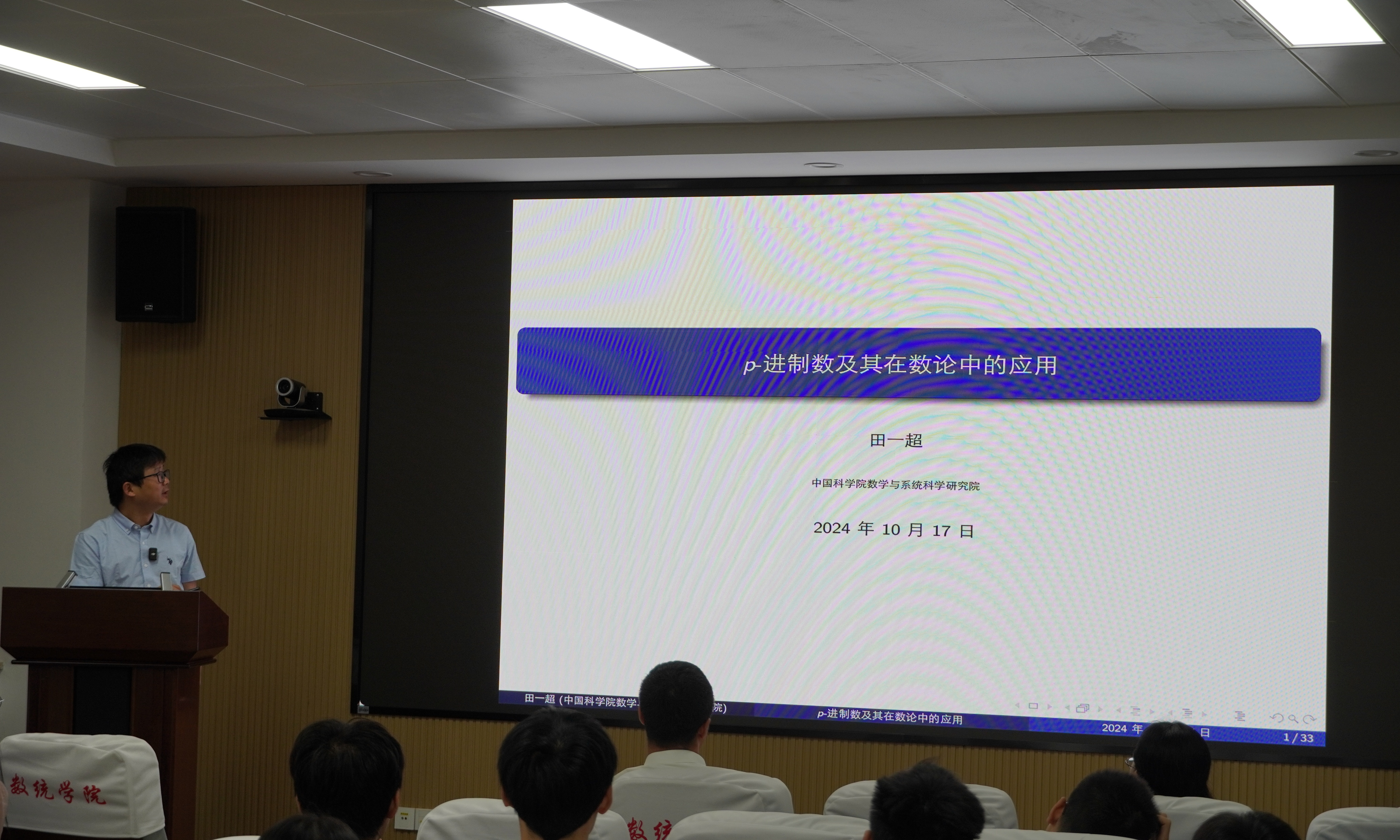 田一超研究员以“p-进制数及其在数论中的应用”为主题,追溯了“数”的历史脉络,循序渐进地引出了p-进制数的起源与定义,系统性地介绍了p-进制绝对值的概念、p-进制数集的界定及其蕴含的几何与代数特性,深刻揭示了p-进制数的独特魅力,探讨了p-进制数在数论中的多维度应用。田一超研究员着重阐述了p-进制数在丢番图(Diophantine)方程中的应用、Hasse-Minkowski定理及其推论、p-进制伽罗华表示及Langlands纲领,并以多个具体的例子对p-进制数在数论中的应用有了更直观的理解。在讨论环节,与会者积极提问,田一超研究员耐心解答,现场学术氛围浓厚。