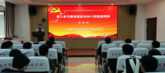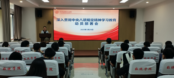 部署会后,数统学院开展了深入贯彻中央八项规定精神学习教育读书班暨党委理论学习中心组(扩大)会。学院党委郑世珠书记带头领学,围绕“中央八项规定及其实施细则精神”“深入贯彻中央八项规定精神要求”等方面,结合校情校史和典型案例,明确了学习要求。会议强调,全体党员要把深入学习贯彻落实中央八项规定精神与清明政风、清正教风、清新学风等廉洁文化教育紧密结合,弘扬“正能量”,不断增强中国特色社会主义制度自信,确保学习教育铭记于心、规范于行,努力做自我革命的表率,以严明纪律护航党的事业行稳致远。