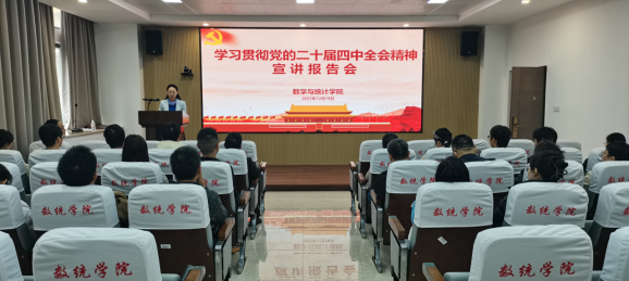 12月19日下午,数统学院党委在院208报告厅举办党的二十届四中全会精神宣讲报告会。学院党委书记郑世珠主持会议,党委副书记蓝荣聪教授领学全会精神,学院党委委员、各师生党支部书记及支部委员参会学习。