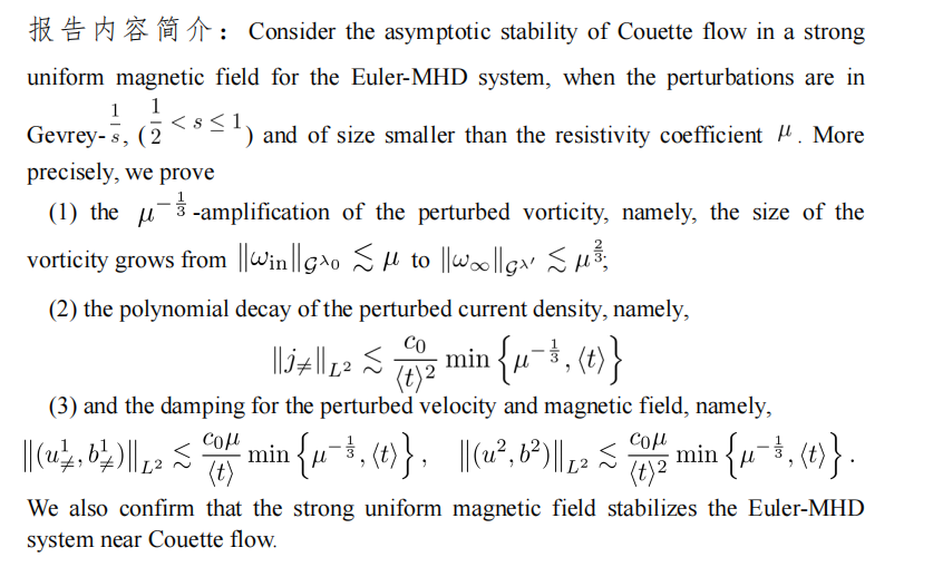 报告题目:Asymptotic stability of Couette flow in a strong uniform magnetic field for the Euler-MHD system