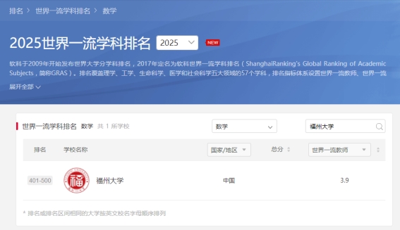 近日,高等教育评价专业机构软科正式发布了2025“软科世界一流学科排名”。福州大学数学学科发展迈上新台阶,首次跻身榜单,位列全球401-500区间。
